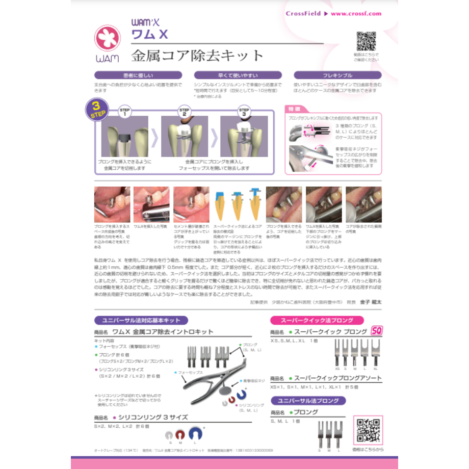 | ラインナップ | ● ワムX 金属コア除去イントロキット(ユニバーサル法対応基本キット) セット内容 ・フォーセップス(衝撃吸収ネジ付) ・プロング 計6 個(プロングS×2/ プロングM×2/ プロングL×2) ・シリコンリング3 サイズ(S×2 / M×2 / L×2)計6 個 ※3 種類のプロング(S,M,L)によりほとんどのケースに対応可能。 ※シリコンリングは切れていませんのでスーチャーシザーズなどで切ってから使用してください。 ● プロング(ユニバーサル法プロング単品) S、M、L 1個 ● スーパークイックプロング(スーパークイック法プロング単品) XS、S、M、L、XL 1 個 ● スーパークイックプロングアソート XS×1、S×1、M×1、L×1、XL×1 計5 個 ● シリコンリング3サイズ S×2、M×2、L×2 計6個 ※オートクレーブ対応(134 ℃) |